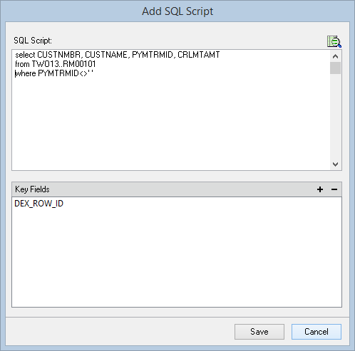 Once you have selected the SQL Script option to add, it will open the Add SQL Script window where you can enter in the SQL Script you want to use. You will also need to pick the key fields(s) from that script.